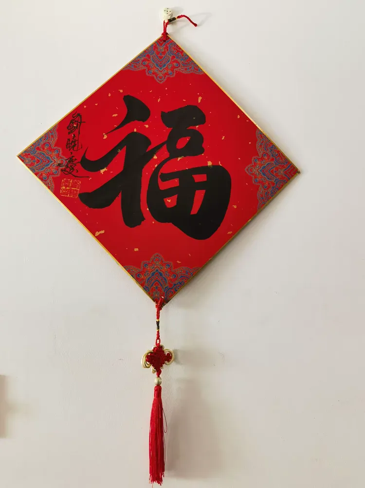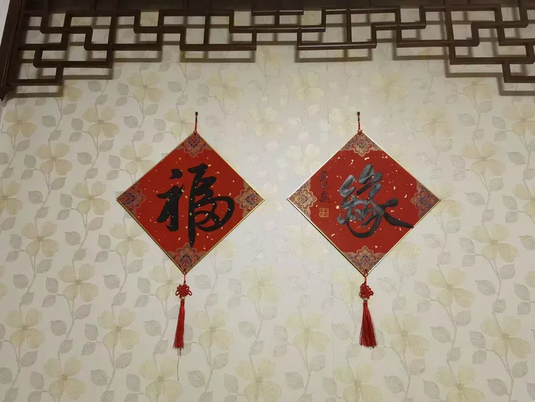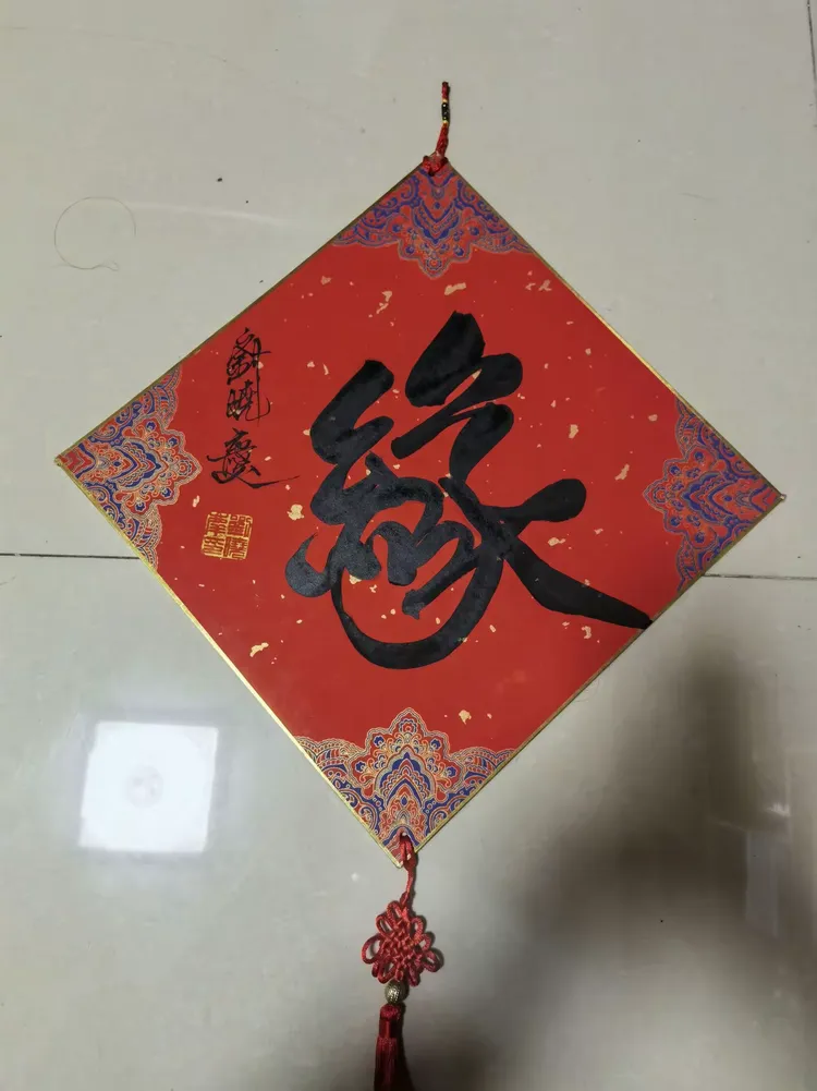 回家,将庆姐的缘字和我的福字挂在书房,相映成趣,迎贺新春。非常有缘的是,我竟和庆姐选用的同一种硬纸。有缘之人总在有缘之处相会哈。
